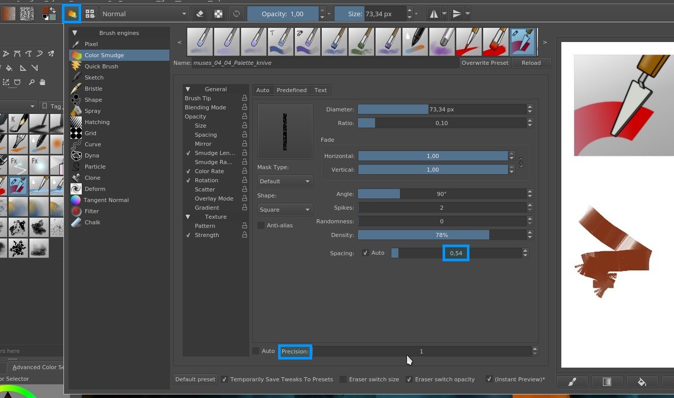 Nota: Si por alguna razón veis que este pincel produce algo de "Lag", una cosa muy útil que acelera tanto este pincel como muchos de los de Krita es utilizar el parámetro "precisión" dentro del editor de pinceles y bajarlo de 5 a 1. Si además utilizas tamaños grandes puedes aumentar el espaciado del pincel hasta 0.5 o 0.7. Se puede optimizar aun más para ganar velocidad en tamaños muy grandes.