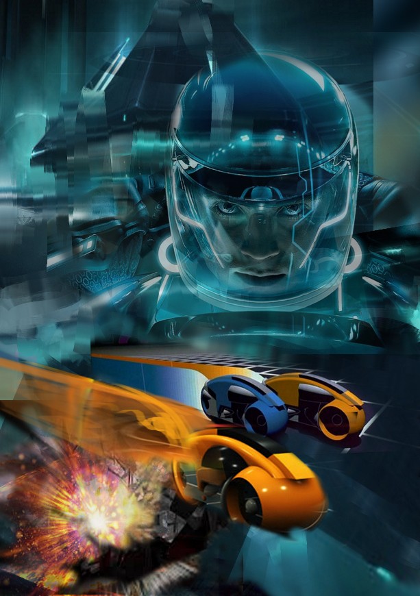 Siendo el juego un calco del juego de TRON no me parece una locura coger referencias de la película. Ya que vamos a hacer una copia de un clásico vamos a hacerlo bien. ¡Que se note! Por eso creo una composición con las múltiples referencias para luego pintar por encima lo que necesite y llegar al resultado que quiero, no tan foto sino más 2d. Queda aun mucho trabajo.Este sistema no es el único que uso para mis ilustraciones.
