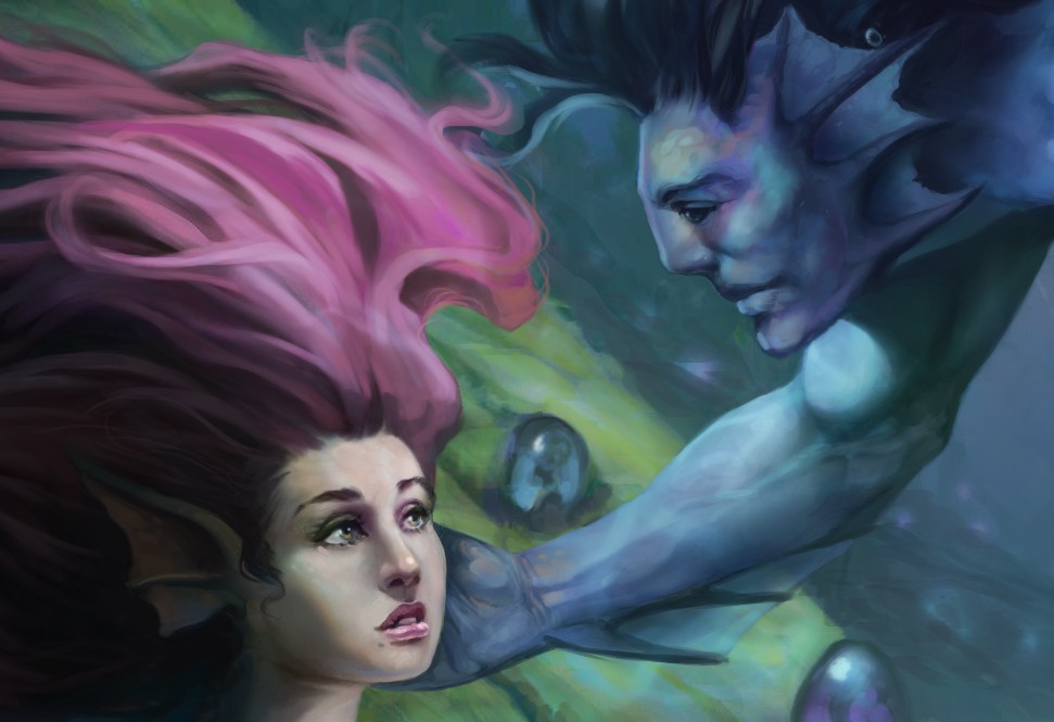 La cara de ella quizás ha sido la parte más difícil. 3 veces la repetí hasta dar con el gesto que buscaba, una pose de inocencia y a la vez de "me dejo seducir por este guapo sireno" ;D